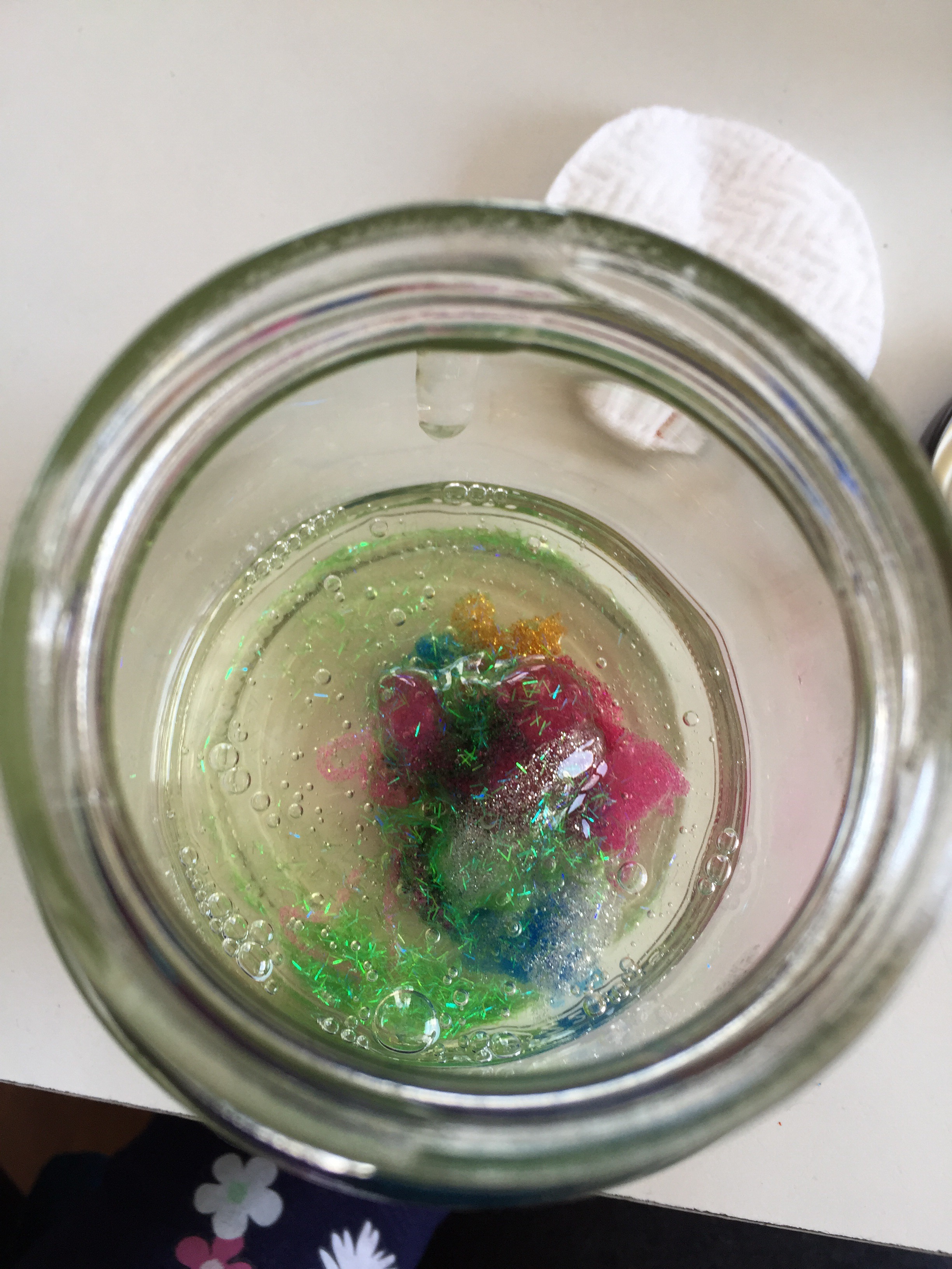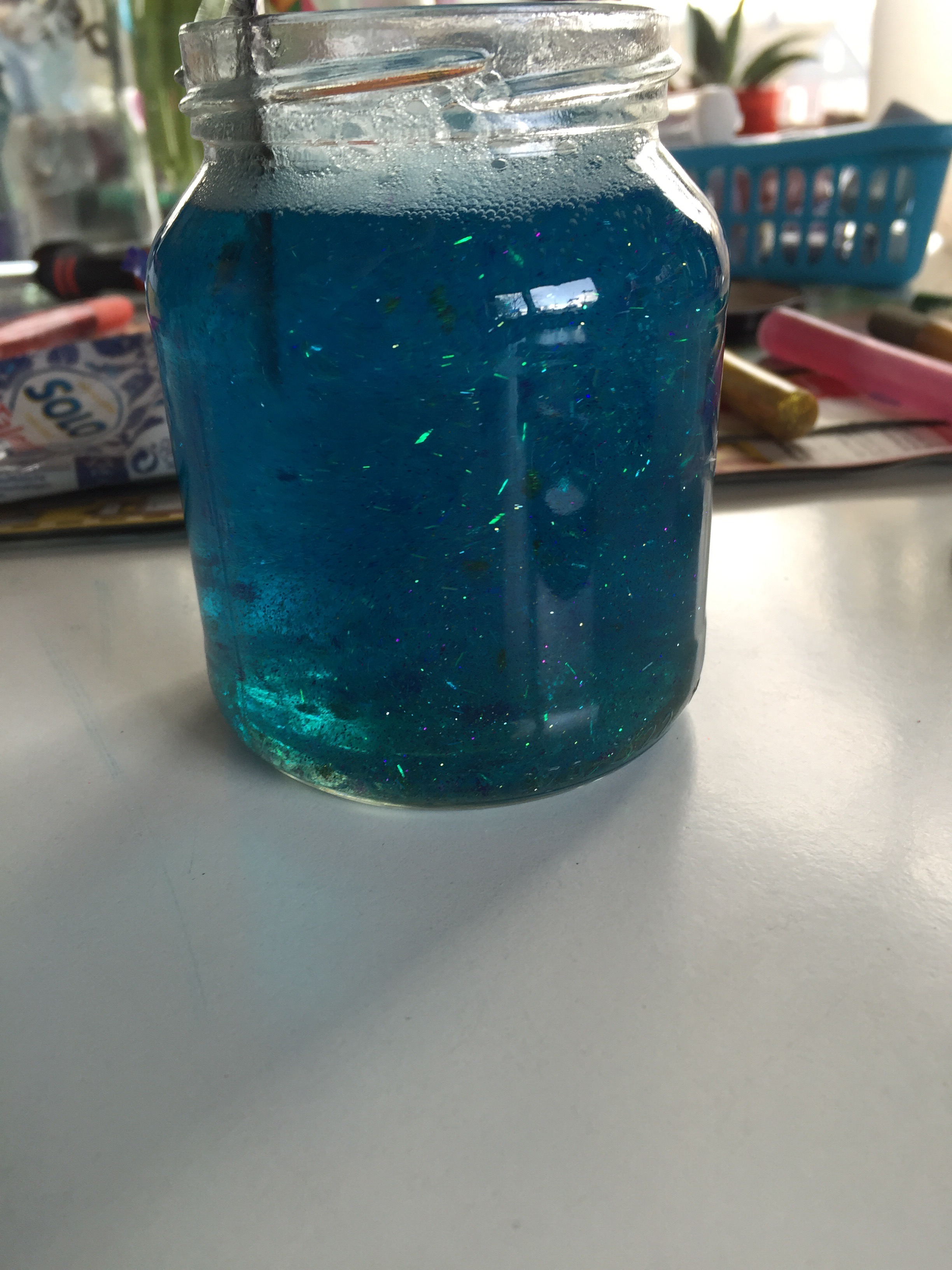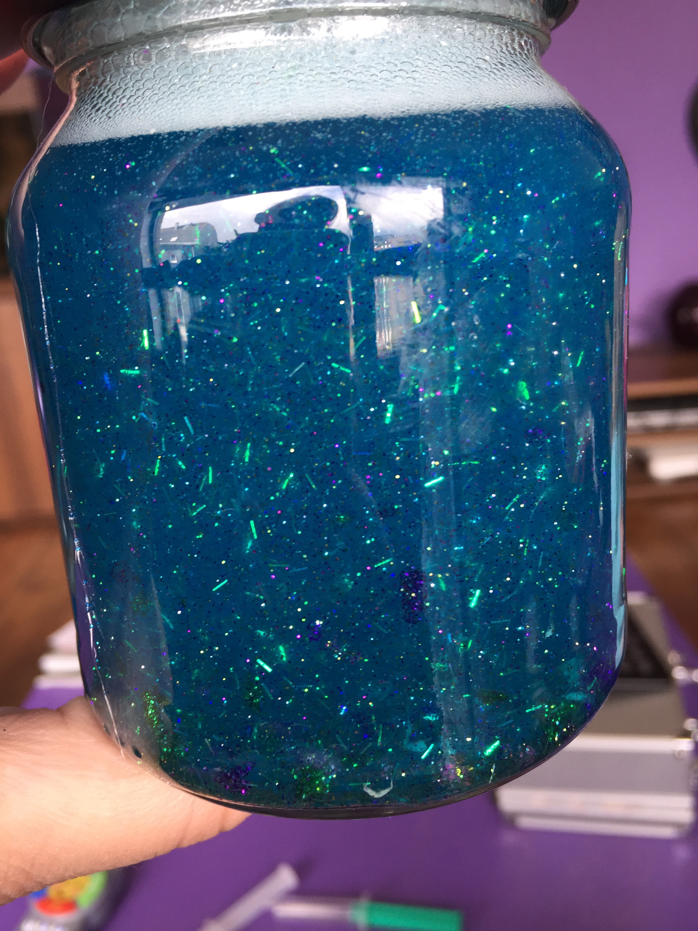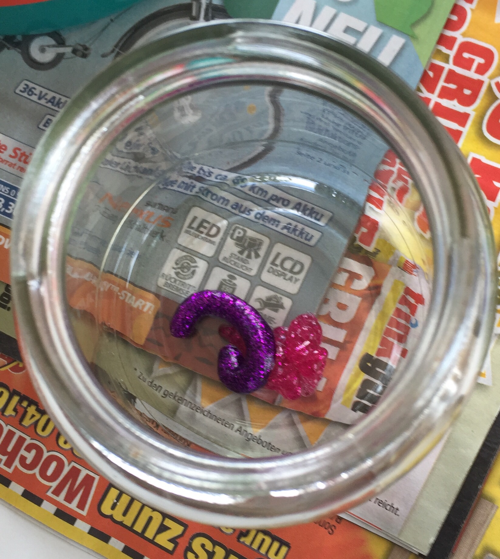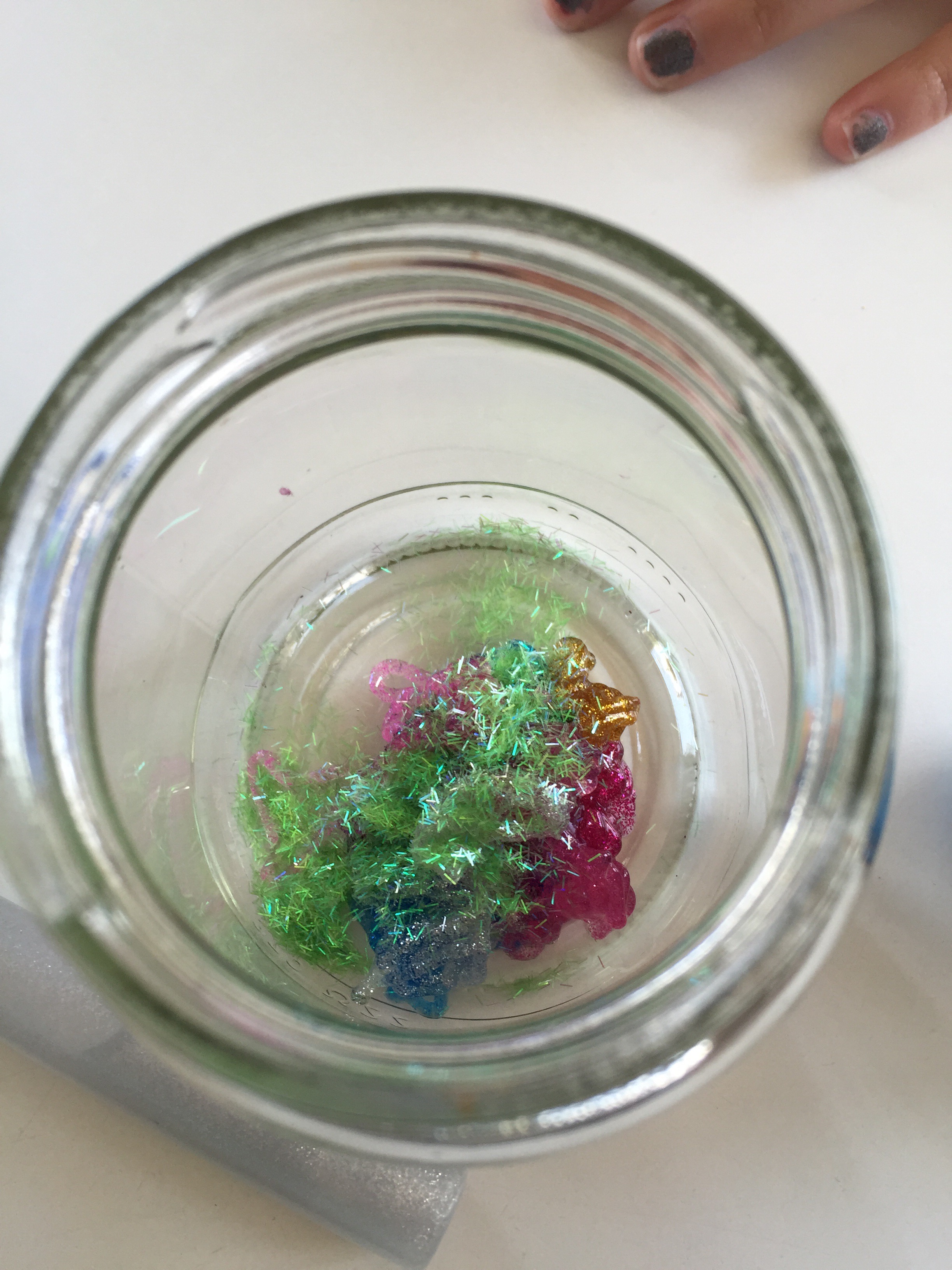 Ich hab jetzt schon mehrfach im Internet Glitzerschleim und Glitzergläser gesehen. Glitzergläser sollen auch noch gut dafür sein um Kinder zu beruhigen. Aber mir reichte alleine schon der Glitzer um das mal auszuprobieren.
